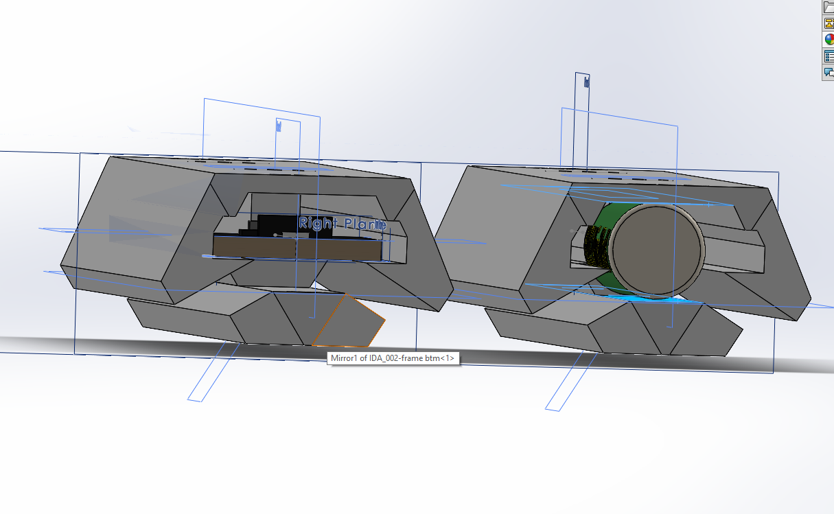 if i can make the fault lines much longer i can make it stronger, the perfect way to do this would be if i printed it vertically, unfortunately my printer isnt tall enough and this would demand an INSANE amount of support material to work. what i can do instead is flip it onto the diagonal side there, this would strengthen the frame considerably on that side, and though only slightly on the opposite side, it would still be stronger than purely horizontal. theres various other ways to improve the design, this is just one of the simplest ones that doesnt require changing it at all. A very simple one i could implement with only a slight change would be splinting those narrow walls, although if i printed a tiny hole it would fill, that area would still be a wide solid patch with no hole and could be drilled out, not that id need to, i could insert a heated metal pin into the diagonal “hole” (with a perfect print there would actually be a hole), 2-3 per side would protect it againt snapping. the ideal method though would be to find a way to get some high tensile metal to bear the brunt of the force.